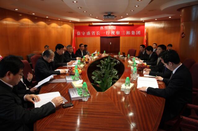 圖為省委副書記、省人民政府省長徐守盛(左排左四)一行在三湘集團有限公司會議室聽取公司董事長、總經理劉勝輝(右排右三)匯報工作。