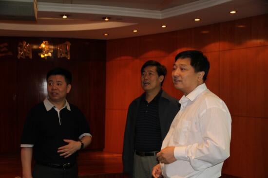 圖為益陽市市長助理曾憲軍先生(右二)和三湘集團有限公司董事長劉勝輝先生(左二)、湖南鐵路投資集團有限公司副總經理李維克先生、益陽交通局副局長楊正才先生合影。圖為三湘集團有限公司董事長劉勝輝先生(右一)向益陽市市長助理曾憲軍先生(中)介紹三湘集團有限公司情況。
