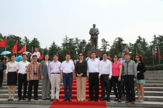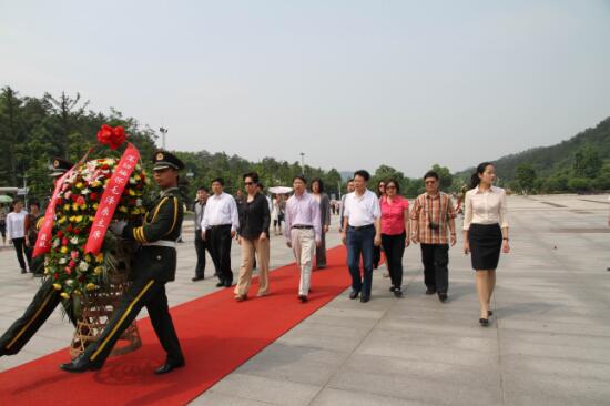 圖為香港中聯(lián)辦副主任郭莉一行在三湘集團(tuán)有限公司董事長(zhǎng)劉勝輝陪同下向毛主席塑像敬獻(xiàn)花籃。