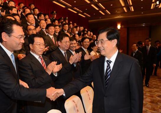 圖為胡錦濤主席與中央駐港機構和主要中資機構負責人親切握手。